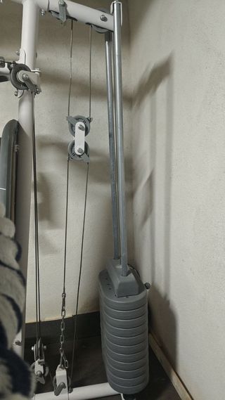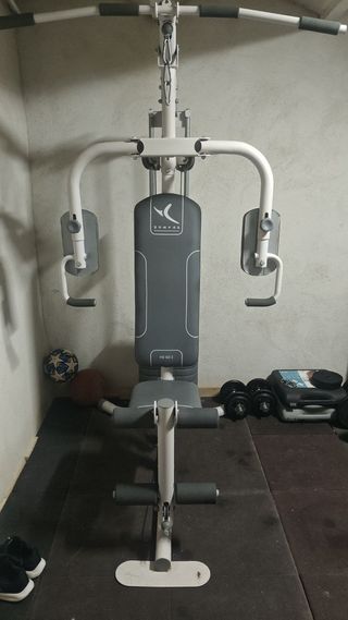 Multiestación Domyos HG-60 3 en color gris y blanco. - Asiento acolchado. - Brazos de press. - Soporte para piernas.