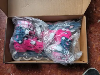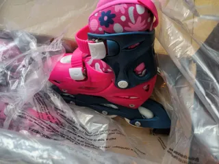 Patines en línea para niña con un diseño divertido y colorido. - Color rosa y azul. - Cierre de velcro y hebilla. - Ruedas de patinaje.