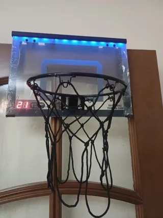 Canasta de baloncesto con marcador digital y luces LED azules, y te anima cuando encestas, aun mantiene el plastico protector, puede ser para interior tambien , y se puede colgar en puertas - Tablero transparente. - Aro de metal negro. - Red de malla negra.