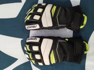 Guantes de esqui alpino marca Reusch, modelo Profi SL, talla 8,5 de hombre (etiquetas retiradas). Color negro, blanco y amarillo flúor (un poco sucio debido a que se han tratado los guantes con cera de abeja para su mantenimiento). Palma de cuero resistente y dorso de cuero con protecciones blandas en dedos. Impermeables, cortavientos y muy abrigados gracias al aislamiento G-loft y puño de neopreno ajustable con velcro.