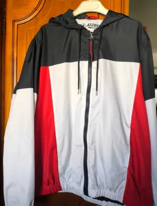 Cortavientos de la marca Alcott hombre en talla L. Diseño moderno y funcional. Muy buen estado. - Color azul, blanco y rojo. - Con capucha. - Cierre de cremallera.