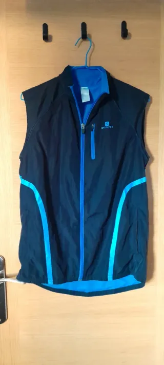 Cortavientos con doble uso como chaqueta o chaleco, con mangas desmontables con cremallera. Bolsillos laterales y frontal, espalda aireada, bandas azules reflectantes. Con muy poco uso.