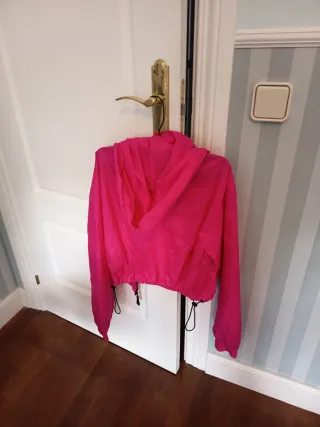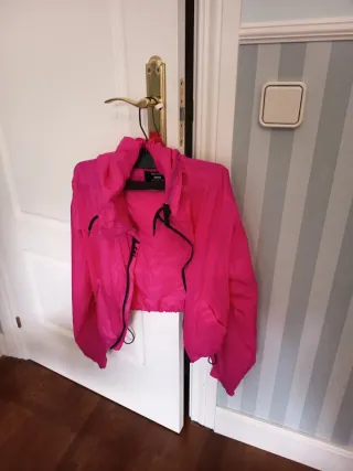 Cortavientos rosa de la marca Bershka. - Talla M, pero también vale para una S. - Diseño ligero y cómodo. Es muy finita y queda cortita. Fuksija o rosa flúor.
