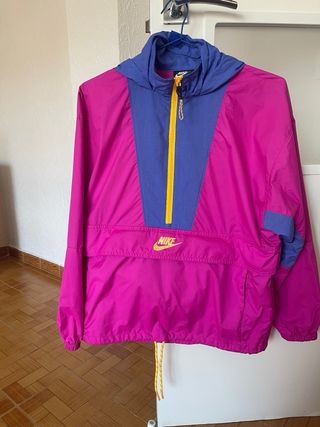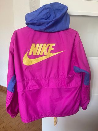 Cortavientos de la marca Nike con un diseño llamativo. - Se hace riñonera, lleva las tiras en el bolsillo. - Talla XS - Color principal rosa fucsia. - Capucha y detalles en azul. - Logo de Nike grande en la espalda.