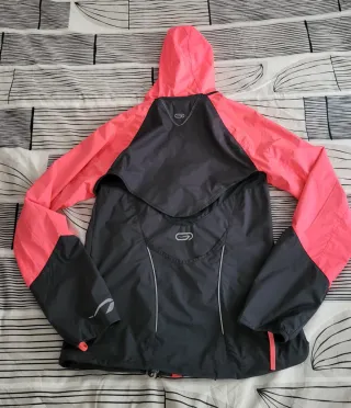 Chaqueta deportiva tipo cortavientos convertible en chaleco marca Kalenji en color gris y rosa con detalles en neón y paneles reflectantes la hacen ideal para actividades en el aire libre y la noche. -Convertible en chaleco: perfecto para todo el año. - Diseño bicolor ideal para el aire libre ideal para actividades al aire libre como el running, la bici etc... - Capucha integrada. - Cremallera frontal. - Bolsillos laterales con cremallera. - Puños ajustados. - Cintura ajustable. Talla 36 (segun etiqueta) S/M (ver cm en las fotos) Valorada en más de 50€.