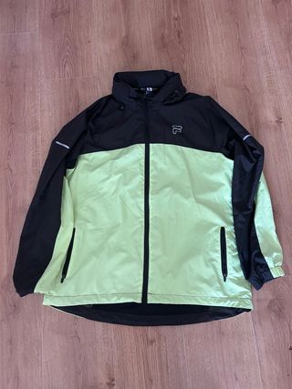 Cortavientos de la marca Fila en talla S. Diseño bicolor en negro y verde lima. - Cremallera frontal completa. - Bolsillos laterales con cremallera. - Puños elásticos. - Capucha integrada.