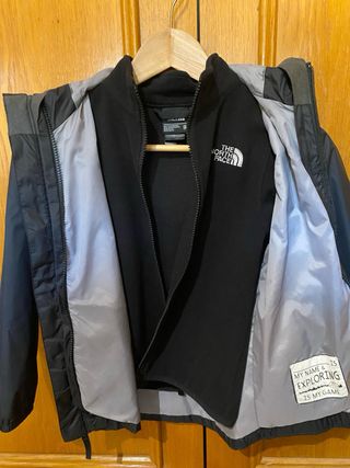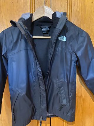 Chaqueta infantil The North Face talla XS. Forro polar + cortavientos. Se unen con cremallera y se pueden usar de forma independiente. Con capucha y totalmente Impermeable. Protege del viento y del frio. Muy poco uso. Como nueva. - Diseño cortaviento. - Forro interior de polar.