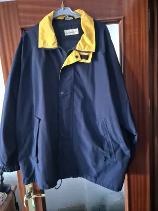Chaqueta impermeable cortavientos y con forro. Resistente al viento y al agua. Cremalleras y costuras selladas. Bolsillos laterales y cintas de velcro en mangas Talla XL generosa Casi sin uso aunque tiene alguna pequeña mancha.