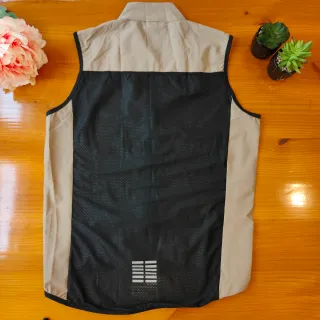 Chaleco cortavientos de color beige, ideal para protegerte del viento y la lluvia. Talla M - Cierre completo con cremallera. - Ribete negro en cuello y sisas. - Parte trasera de malla transpirable.