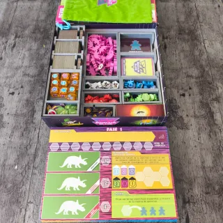 Juego de mesa Dinosaur Island más inserto Folded Space y todas las cartas enfundadas. - Incluye variante en solitario. - Diseñado por Jonathan Gilmour y Brian Lewis. - Publicado por Devir y Pandasaurus Games.