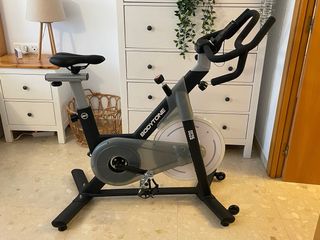 Bicicleta de spinning para entrenamientos en casa. Usada un par de veces, está como nueva. Incluye cuentakilómetros, funda de sillín blanda y soporte para el móvil, que se compro aparte. Su precio en decathlon es 200 sin los accesorios. Solo venta en mano. - Manillar ajustable. - Sillín ergonómico. - Rueda de inercia.