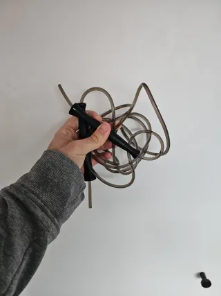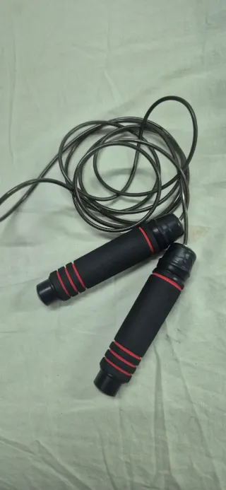 Comba de saltar de la marca Decathlon. Ideal para entrenamientos. - Cuerda de acero recubierto de goma. - Empuñaduras ergonómicas. - Tiene un pequeño golpe en una de las empuñaduras. - Longitud total 3 metros. - Longitud ajustable