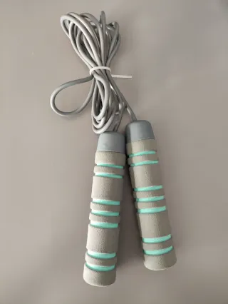 Comba de ejercicio con mangos acolchados. - Mangos de espuma gris con detalles en verde menta. - Cuerda gris. - Ideal para entrenamientos. Comprada en Decathlon