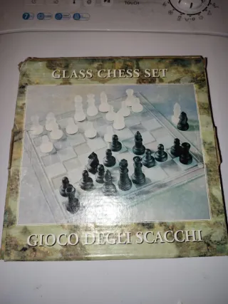 Set de ajedrez con tablero y piezas de cristal. - Piezas de ajedrez transparentes y negras. - Tablero de cristal con diseño. - Juego de mesa clásico.