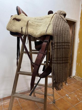 Silla de montar a caballo completa, lista para usar. - Incluye manta de borrego. - Manta de cuadros de lana. - Cincha de cuero. - Estribos de cuero.