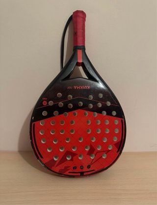 Pala de pádel Kuikma Sop con un diseño llamativo en rojo y negro. - Superficie con agujeros. - Mango de color rosa. - Correa de seguridad negra.