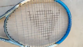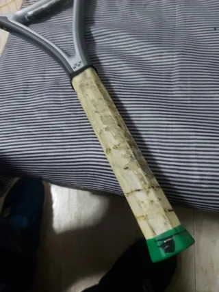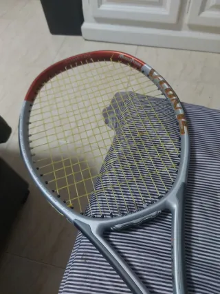 Raqueta de tenis Yonex Muscle Power. - Marco plateado con detalles en rojo. - Cuerdas amarillas. - Diseño deportivo. Le falta po ner el grip buena raqueta