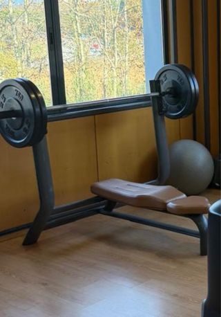 Banco de ejercicios con barra y dos discos de 40 kg cada uno. - Banco de pesas. - Barra incluida. - Dos discos de 40 kg.