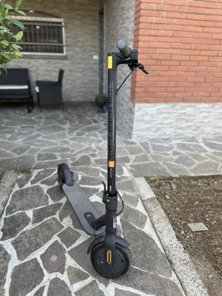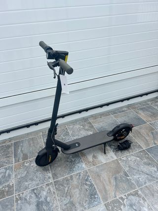 Patinete eléctrico en color negro, ideal para desplazamientos urbanos. - Diseño plegable para facilitar su transporte. - Ruedas resistentes para un paseo suave. - Freno trasero para mayor seguridad. Marca ninebot