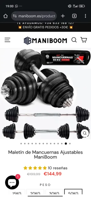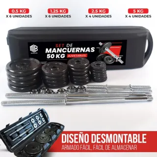 Set de mancuernas ajustables de 50 kg, ideal para entrenar en casa. Incluye todo lo necesario para armar y ajustar el peso. - Incluye discos de: -0.5 kg (x6) -1.25 kg (x6) -2.5 kg (x4) -5 kg (x4). - Dos barras de mancuerna. - Barra con acople para barra larga - Cierre de seguridad para los discos. - Estuche para almacenamiento y transporte con ruedas "USADO 3 VECES VENTA POR FALTA DE TIEMPO" En la página está por 145 € #pesas #mancuernas