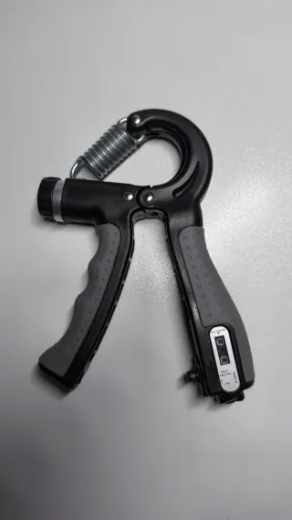 Entrenador de agarre para fortalecer las manos y antebrazos. Cuenta con un contador de repeticiones integrado para seguir tu progreso. - Diseño ergonómico para un agarre cómodo. - Resistencia ajustable mediante un dial. - Contador digital de repeticiones.