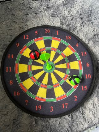 Juego de dardos para divertirse en casa. Incluye una diana y dardos. - Diana con números. - Dos dardos incluidos (uno verde y uno rojo).
