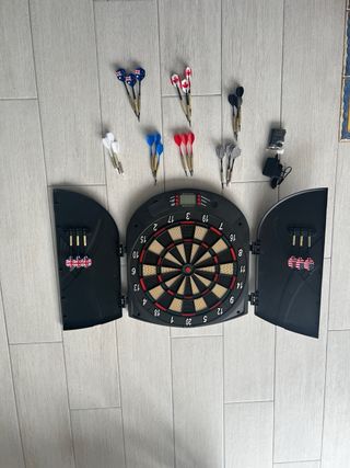 COMO NUEVO!! Solo se usó en 2 oportunidades. Diana electrónica Canaveral con un diseño moderno y funcional. Incluye dos juegos de dardos. - Diana electrónica con pantalla digital. - Dos juegos de dardos (uno azul y otro rojo). - Puertas laterales para guardar los dardos.