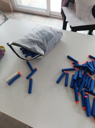 Lote de 50 balas de dardo para pistolas Nerf. Son de color azul con punta naranja. - Cantidad: 50 unidades. - Color: Azul con punta naranja.