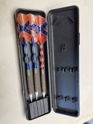 Set de dardos profesionales con un diseño llamativo. - Incluye tres dardos. - Alas con diseño de bandera confederada. - Barriles con agarre texturizado. - Estuche de transporte incluido.