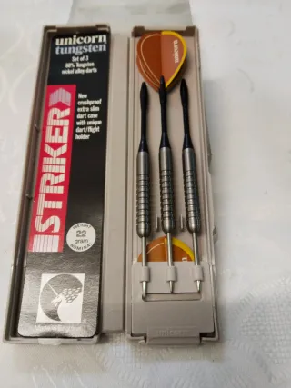 3 Set de Dardos Unicorn Tungsten Striker de 22 -23 y 24 gramos - Fabricados en tungsteno y aleación de níquel. - Incluye un estuche extraplano y resistente. - Diseño con soporte para dardos y plumas. - Hechos en Inglaterra. 25€ unidad.