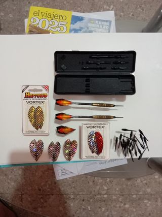 Juego de dardos usados, ideales para principiantes o para practicar. Incluye varios juegos de plumas y cañas. Algunos dardos presentan ligeras marcas de uso, pero están en buen estado general. - 2 juegos completos de dardos - Plumas de repuesto - Cañas de repuesto