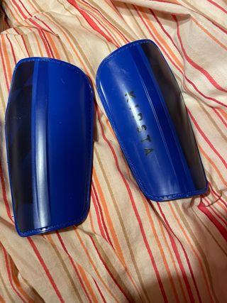 Par de espinilleras de la marca Kipsta en color azul. - Diseño con líneas negras. - Material resistente. - Usadas una sola vez