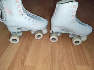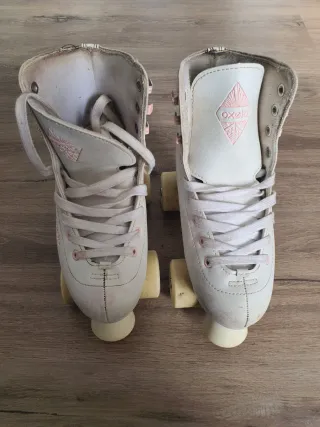 Patines artísticos Oxelo en color blanco con detalles en rosa. Perfectos para iniciarse en el patinaje.4 puestas poco uso - Talla 36/37. - Diseño artístico. - Cierre con cordones.