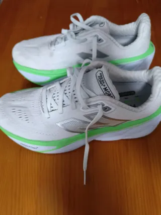 Zapatillas deportivas New Balance Fresh Foam en talla 40. Diseño moderno y cómodo. - Color blanco con detalles en verde lima y plateado. - Cierre con cordones. - Suela con tecnología Fresh Foam X.