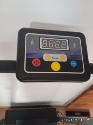 Cinta de correr en buen estado, ideal para caminar en casa. - Superficie de cinta negra. - Pantalla digital con información de ejercicio. - Pasamanos con agarres. - Cable de seguridad rojo.
