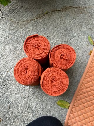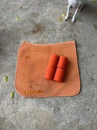 Conjunto de sudadero de doma y vendas para equitación en color naranja. - Sudadero acolchado. - 4 vendas a juego.