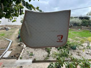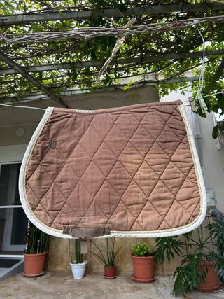 Sudadero de salto para caballo en color marrón. Presenta un diseño acolchado con rombos y ribeteado en blanco y dorado. - Diseño acolchado. - Ribeteado decorativo.
