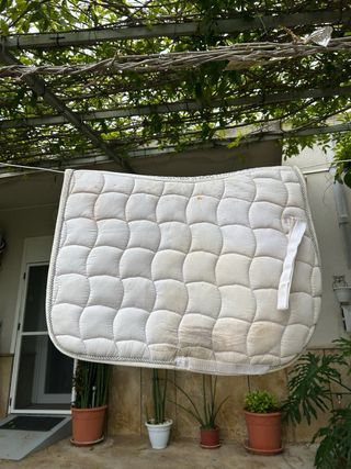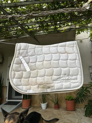 Sudadero de salto de la marca Schockemöhle Sports. Ideal para la disciplina de salto. - Diseño acolchado. - Color blanco con detalles grises. - Cintas de sujeción.