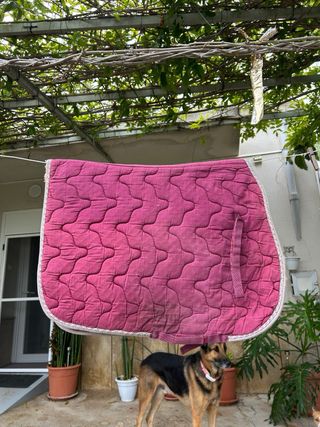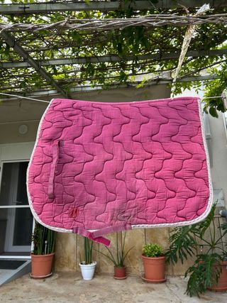 Sudadero de salto para caballo en color rosa. - Acolchado con diseño ondulado. - Ribete blanco y gris alrededor del borde. - Incluye correas de sujeción.