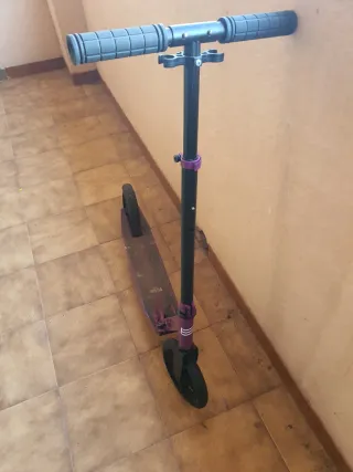 Patinete de dos ruedas con un diseño moderno en morado y gris. Es plegable para facilitar su transporte y almacenamiento. - Ruedas de gran tamaño. - Manillar ajustable en altura. - Plataforma antideslizante.