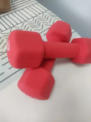 Sin estrenar. Par de mancuernas de 3 kg cada una, perfectas para entrenar en casa. Su diseño hexagonal evita que rueden. - Color: Rojo. - Peso: 3 kg cada una. - Material: Revestimiento de goma.