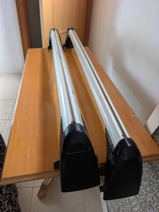 Barras de techo de la marca Audi. Diseñadas para complementar el estilo de tu vehículo y para montar porta esquís. - Material: Aluminio y plástico. - Color: Plateado y negro.