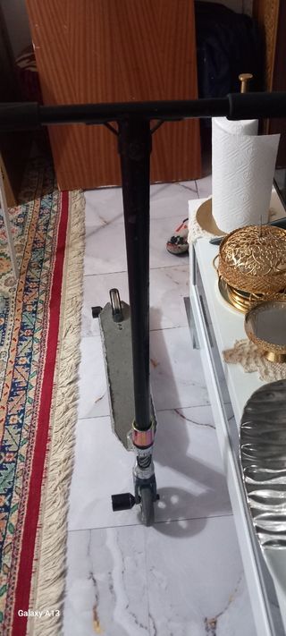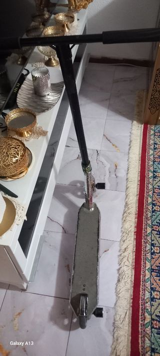 Patinete de estilo libre con manillar negro y plataforma gris. - Manillar negro. - Plataforma gris. - Ruedas pequeñas.