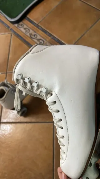 Patines blancos para patinaje artístico, ideales para iniciarse en este deporte. - Diseño clásico y elegante. - Cierre con cordones para un ajuste seguro. - Hoja de patín de acero inoxidable.