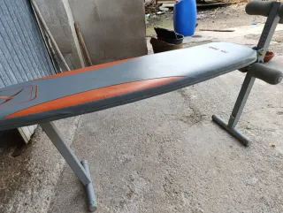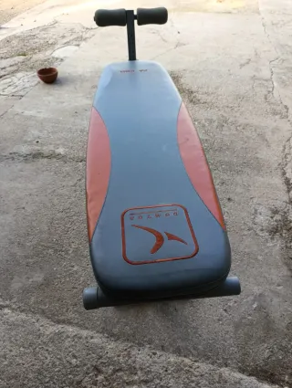 Banco para ejercicios abdominales con un diseño moderno en gris y detalles naranjas. Ideal para tu rutina de entrenamiento en casa. - Estructura metálica. - Acolchado para mayor comodidad. - Reposapiés acolchados.
