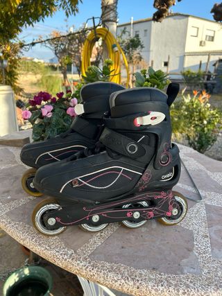 Patines en línea de la marca Oxelo en color negro con un diseño de detalles en color rosa. Perfectos para desplazarse y disfrutar del patinaje. - Diseño con motivos florales y líneas. - Cierre de velcro y hebilla. - Ruedas de patinaje.
