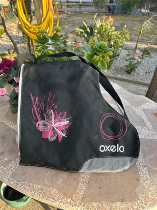Práctica bolsa para transportar patines en línea. - Diseño en color negro con detalles en rosa. - Logo de la marca Oxelo. - Asa para colgar. - Parte inferior de malla.