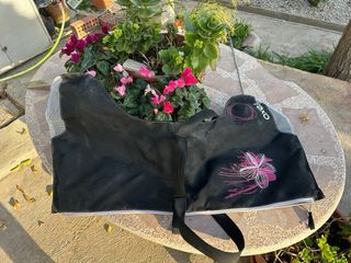 Manta para caballo de color gris oscuro con ribete rosa y azul. Fouganza - Cierre con correas. -Talla 135cm