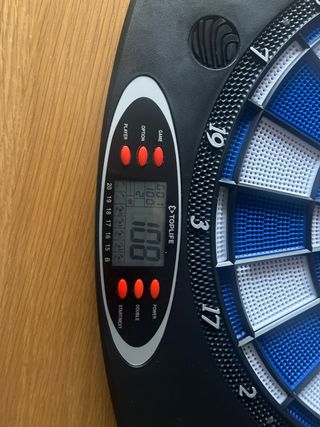 Diana electrónica de la marca Toplife, ideal para jugar en casa. Se encuentra en perfecto estado. - Diseño con segmentos de colores azul y blanco. - Pantalla digital para puntuación. - Incluye números de puntuación alrededor del borde.