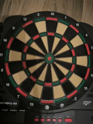 Diana electrónica digital con un diseño moderno y compacto. Funciona con pilas para mayor portabilidad (falta la tapa de las pilas) - Pantalla LCD integrada. - Puertas laterales para guardar dardos. - Marcadores de puntuación visibles.